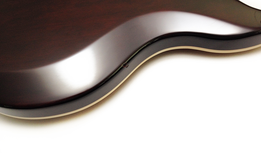 Body Style: Double-cutaway solidbody, Mahogany with bound maple top. Hardware: Vox Super Smooth tuners and MaxConnect bridge Neck Material: Mahogany, glued-in Bridge Pickup: Coaxe Neck Pickup: Coaxe Controls: Master volume and master tone, three way pickup selector switch and two way mode selector switch Hardware: Vox Super Smooth tuners and MaxConnect bridge
