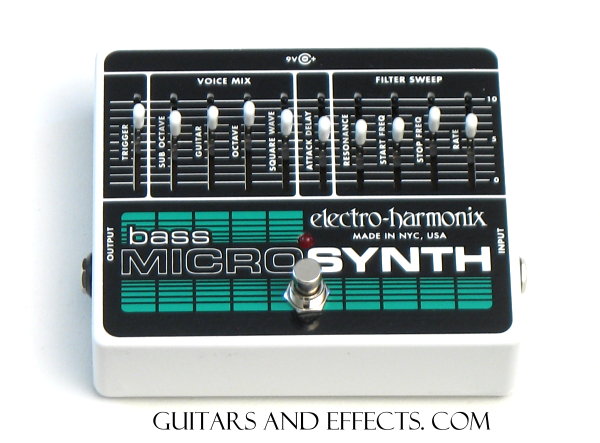 The Bass Micro Synthesizer has the same feature set as the Micro Synthesizer, but includes a trigger and filter sweep range especially tailored for bass guitar. The same fat analog synth textures give your bass a whole new range of possibilities: from percussive stabs to backwards-sounding bowed sounds.