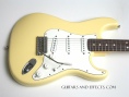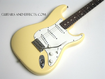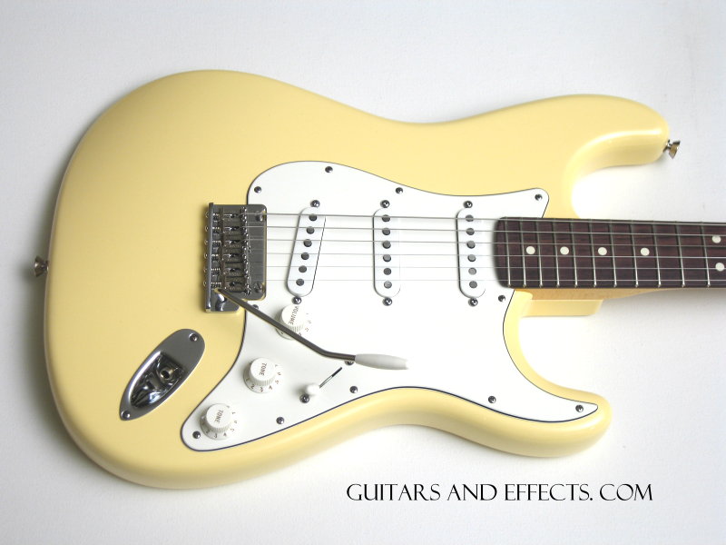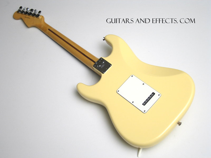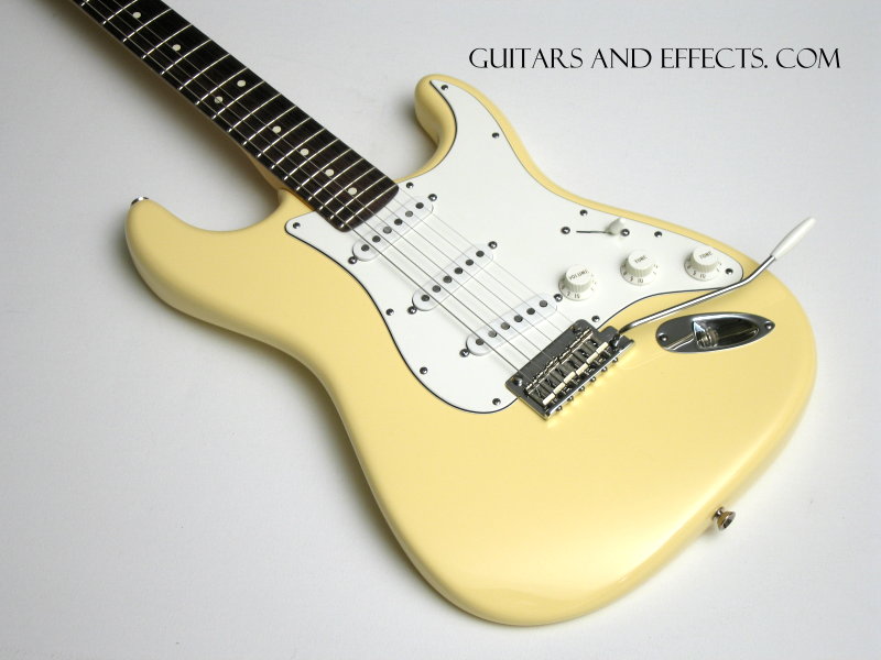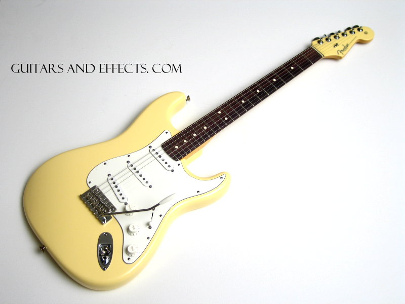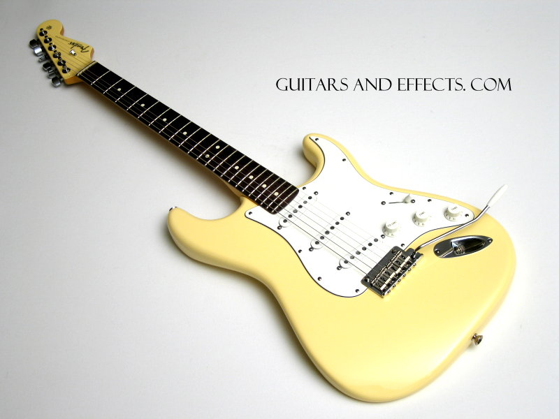Features 2010 USA Model Vintage White Finish with a matching painted headstock 9.5" radius board 22 medium-jumbo frets Maple neck with rosewood fingerboard Chrome 2 point synchronized tremolo New American Standard bent steel saddles Deluxe chrome staggered cast/sealed tuners, 3 alnico V single coil pickups 5-way switch, volume, 2 tone with new Delta tone on the middle and bridge pickups 3-ply parchment pickguard with matching plastic parts Includes molded Fender case 1