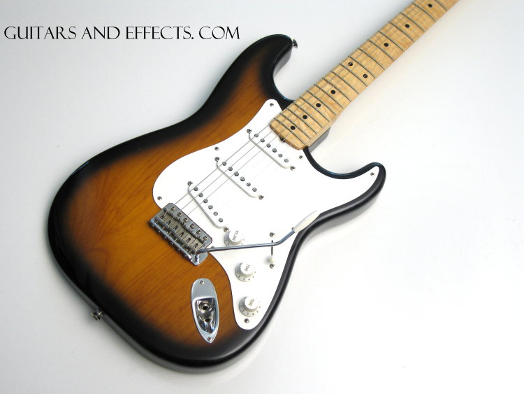 Here is a super cool looking 57 USA Vintage Reissue Fender Strat that has undergone some expensive upgrades. It features a HUGE Custom Warmoth vintage style maple neck. It is extremely flamey and feels absolutely amazing. If you want a vintage style Strat with a big neck for under a grand... This is your axe. It also has a set of Custom Shop Texas Special pickups installed which sound amazing. This guitar rivals many of the Custom Shop Fender guitars we have in stock... No kidding. This is a fantastic guitar. You will not find a better value on a pro quality Strat anywhere. Highly recommended. Includes a hard shell case.