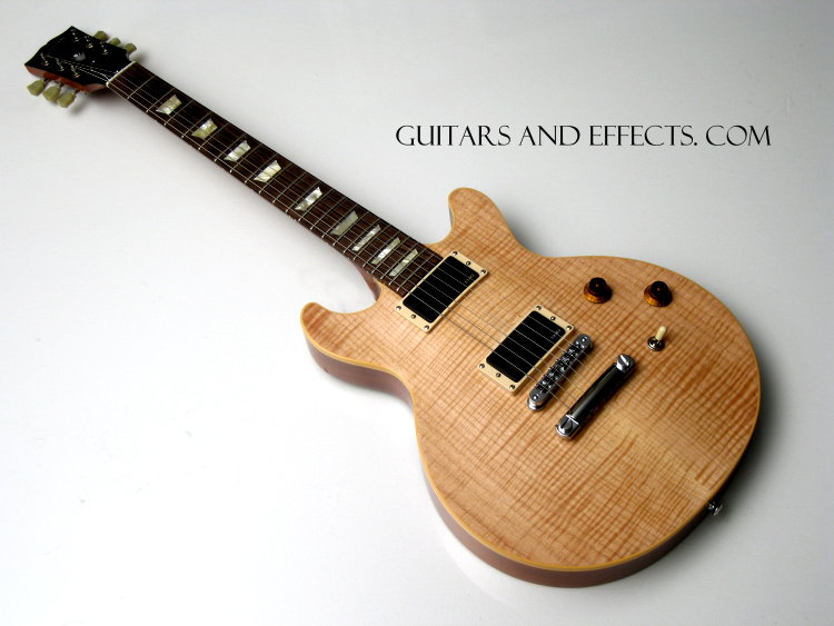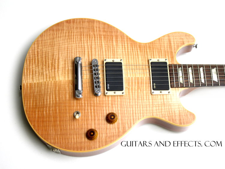 WOW !!! Look at the drop dead gorgeous AAA curly flame maple top on this one !!! It has been upgraded with a great sounding set of EMG active pickups for loud powerful sustain with no noise. Overall condition is excellent with only minor clear coat wear. This is a great playing / sounding instruments with stunning good looks to match. Includes a Gibson hard shell case.