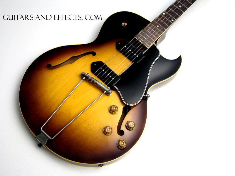 The P-90 pickups in this vintage es-225 are the greatest. This example looks, plays, and sounds spectacular. All original except correct replacement tuners and a filled strap button hole on the heel. If you have been looking for a solid investment professional model 50’s Gibson electric at a reasonable price, this guitar would be an excellent choice. Includes an after market hard shell case.