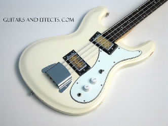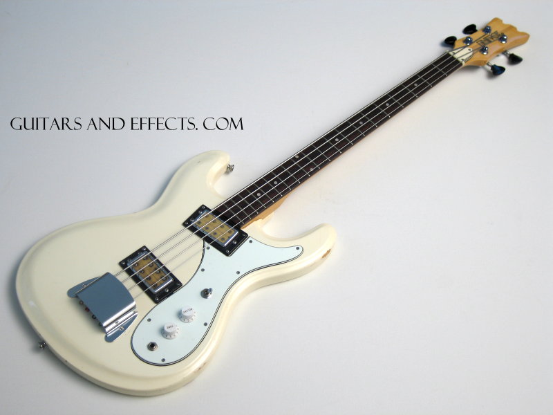 Super cool vintage Univox Hi Flyer Bass. This one plays and sounds great. Newer knobs, otherwise all original. It is finished in White which is by far the coolest color this bass was offered in. It still has its original bridge cover installed. Has some normal wear that you would expect from a bass of this vintage, overall excellent condition. Really neat vintage bass for low dollars.