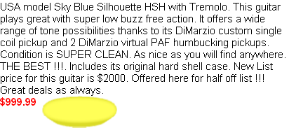 1 DiMarzio custom single coil pickup and 2 DiMarzio virtual PAF humbucking pickups