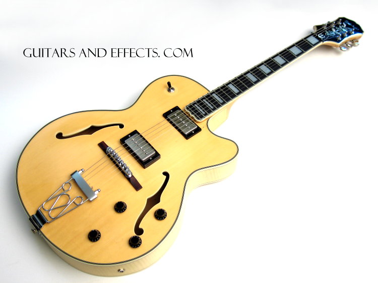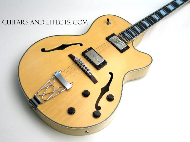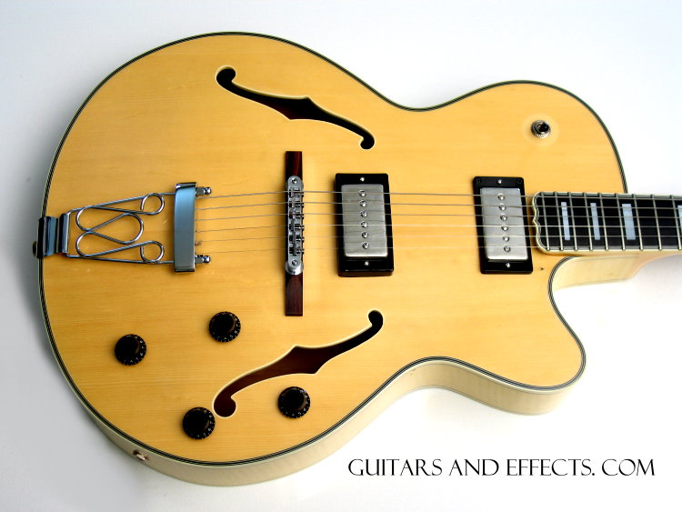 Here is an awesome Jazz / Blues box with serious upgrades. It started out as a nice, but not nearly as cool Joe Pass model. Now add a killer sounding set of Duncan Phat Cat SPH-90 pickups. That’s right, big P-90 tone. Next a set of Grover tuners for stable tuning, a new chrome tailpiece, and an ABR/Nashville bridge round out the package for perfect intonation. Some play wear, but overall a great looking example. Plays and sounds great. Includes a hardshell case